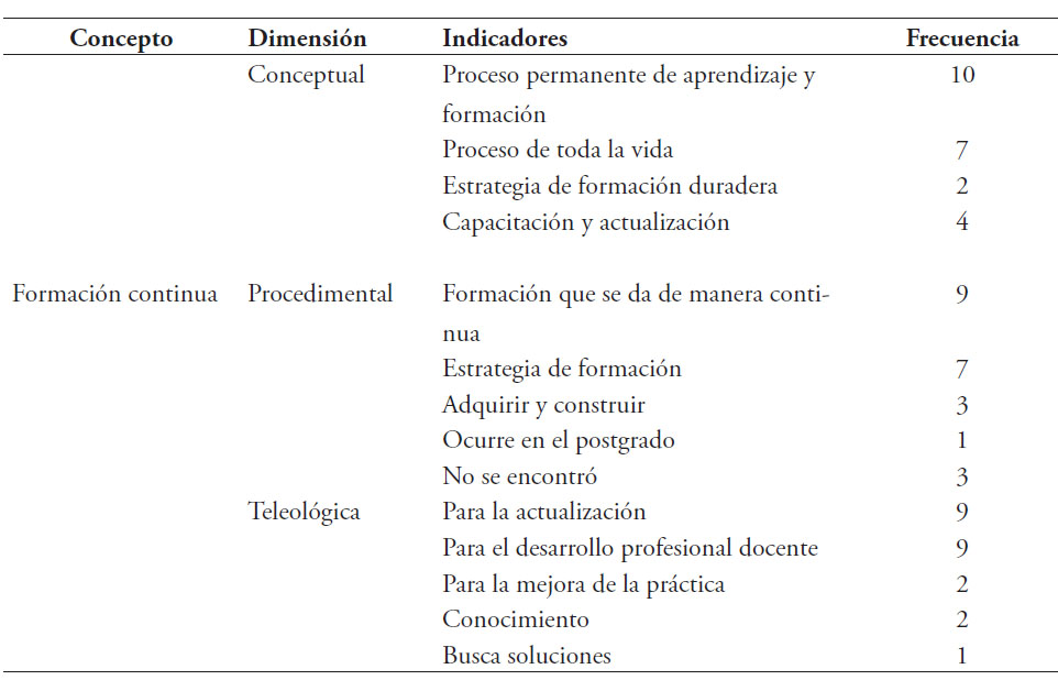 Desde la dimensión conceptual se observó que 8 de 23 participantes la asociaron con un (a) proceso permanente de aprendizaje y formación en el cual se plantea continuar estudiando, actualizándose y construyendo conocimientos de forma continua. Por su parte, 5 de 23 participantes la asocian con (b) proceso de toda la vida; 2 de 23 con (c) estrategia de formación duradera; y 4 de 23 con (d) capacitación y actualización.