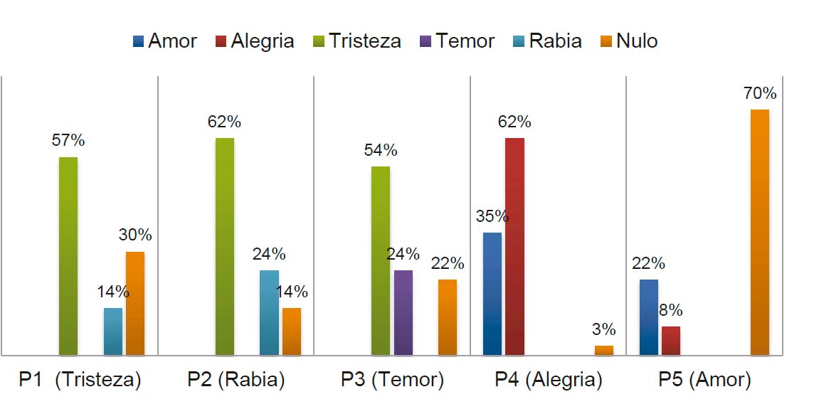 Las niñas de 1º y 2º grado de primaria presentan un comportamiento afectivo similar al descrito en la Figura 1, que corresponde a la totalidad de los y las participantes. Esto quiere decir que identifican la tristeza con un 57% en la P1, 62% en la P2 y 54% en la P3, aunque en estas dos últimas no es el sentimiento esperado.