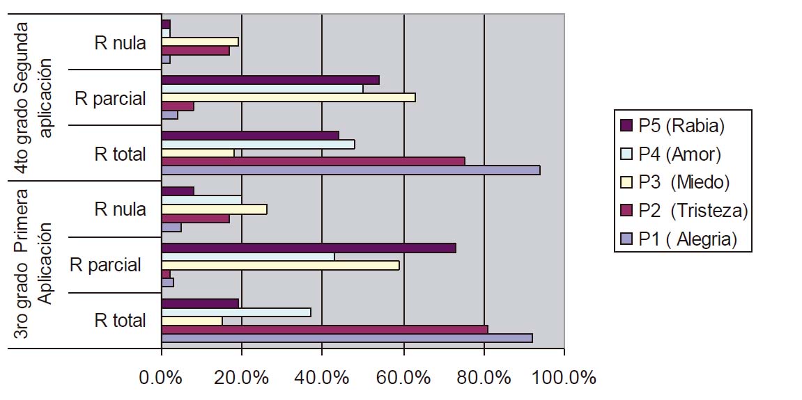 Con respecto a la respuesta parcial de reconocimiento de sentimientos, que no es la esperada, pero es aceptada, aumentaron las referidas a la rabia, del 55% al 66%; el temor, del 55% al 68%; la alegría, del 36% al 40%, y el amor, del 9% al 12%; mientras que la tristeza parcial disminuyó del 17% al 4%.