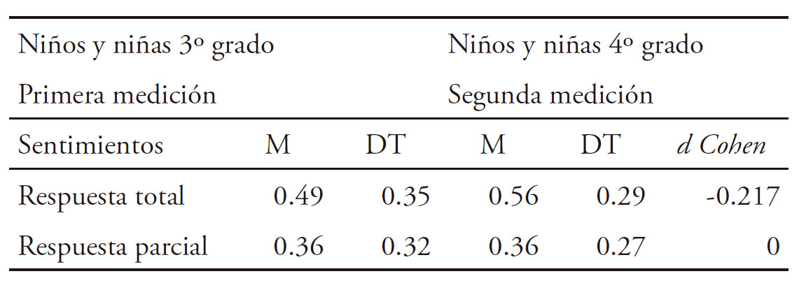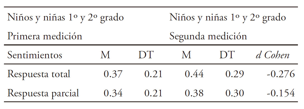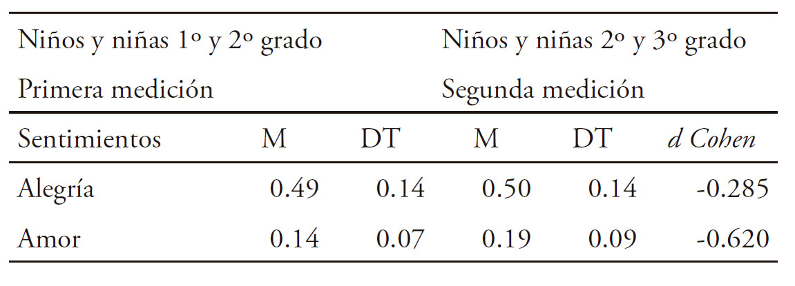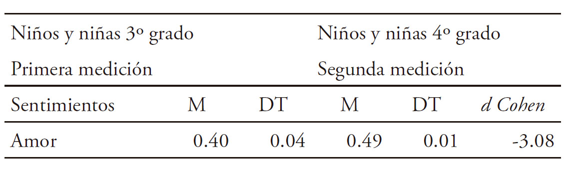 La tabla 3 especifica el tamaño del efecto para los sentimientos alegría y amor. El primero con una M=0.46 DS=0.14 aumentó a M=0.50 DS=0.14. El segundo con una M=0.14 DS=0.07 incrementó a M=0.19 DS=0.09. El tamaño del efecto en la alegría fue pequeño, con un d= -0.285, mientras que el amor presentó una d= -0.620, correspondiente a un tamaño del efecto moderado.