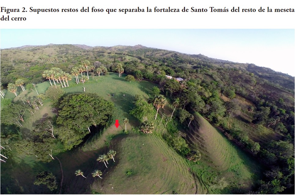 Las primeras prospecciones arqueológicas abrieron interrogantes y crearon hipótesis sobre la estructura de la fortaleza, además de marcar la manera en que serían desarrollados los estudios posteriores. Entre las ideas básicas derivadas de la vinculación directa de las exploraciones arqueológicas con las fuentes históricas se incluyen las siguientes: a) la fortaleza estuvo construida en forma de torre cuadrangular con ventanas y pudo ser una edificación central rodeada por una empalizada o estacada de defensa exterior; b) se trataba de una sencilla pero fortísima casa de madera protegida por un amplio cercado de postes; c) existió un foso que separaba el pequeño promontorio donde estuvo enclavada la fortaleza del resto de la meseta, ese foso (figura 2) fue cubierto por un puente levadizo que permitía el acceso al portón (Boyrie Moya, 1965).