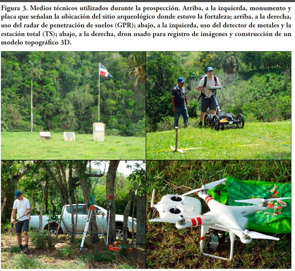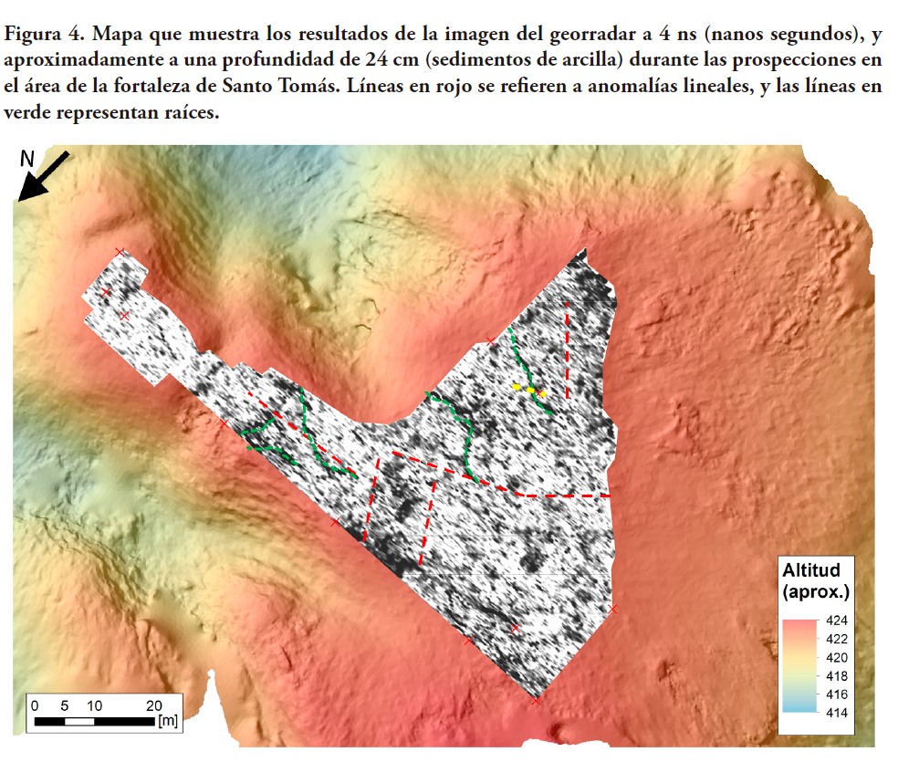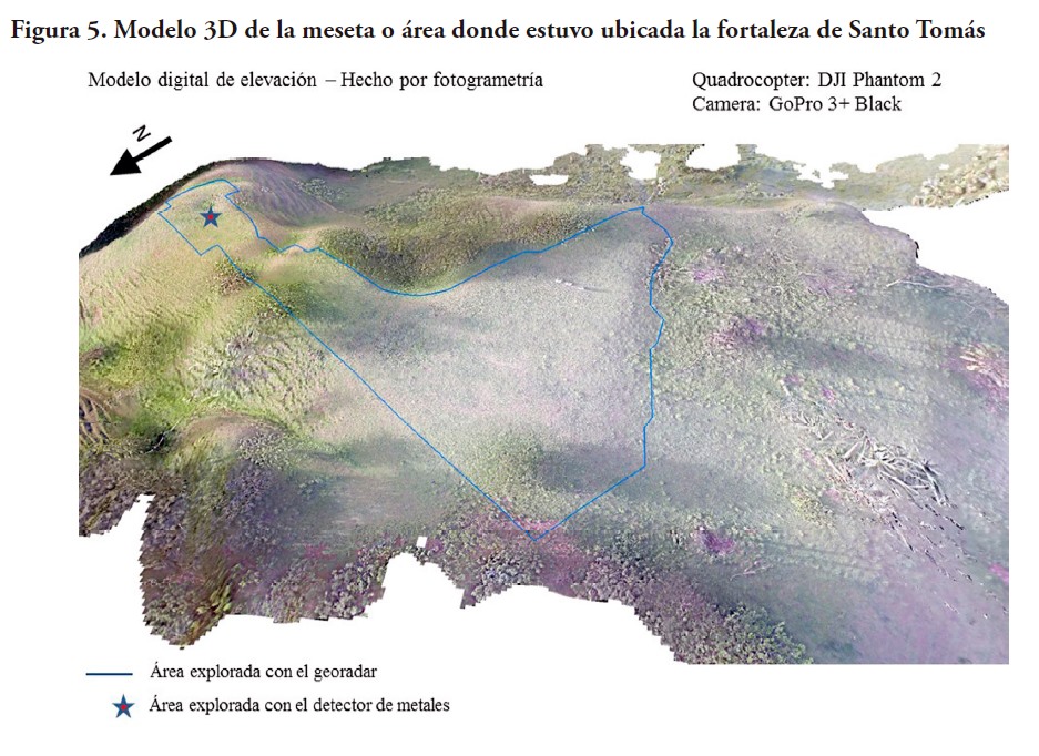 Las exploraciones desde una perspectiva micro, se llevaron a cabo en el área donde se presume estuvo enclavada la fortaleza de Santo Tomás, para ello se utilizó un georradar (GPR) con la finalidad de investigar el subsuelo y localizar vestigios de la antigua estructura u otros elementos culturales significativos (figura 3). También fue empleada fotogrametría a partir del registro de imágenes de un modelo topográfico del lugar, utilizando un pequeño avión no tripulado (dron) (Sonnemann et al. 2016a). Además, se utilizó un detector de metales con la finalidad de localizar vestigios en este material (clavos, utensilios o herramientas) vinculados a la construcción de la antigua estructura o la vida cotidiana dentro de ella.