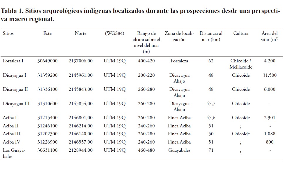 Las exploraciones desde la perspectiva macro-regional, también tomaron en consideración la ubicación de los sitios arqueológicos reportados por la expedición del Museo del Hombre Dominicano (Ortega, 1988; Guerrero y Veloz Maggiolo, 1988) en los años ochenta, además de los sitios reportados por la bibliografía arqueológica dominicana durante la segunda mitad del siglo XX (Ortega, 2005; Veloz Maggiolo, 1972; Veloz Maggiolo y Ortega, 1980; Veloz Maggiolo et al., 1981). Otro factor importante fue considerar la recurrencia de ciertas características en los patrones de asentamiento indígenas de la región (altura, distancia a fuentes de agua dulce, presencia de plataformas o montículos (Sonnemann et al., 2016), y distancia entre asentamientos, etc.). En general, en este primer acercamiento arqueológico a esta sección de la ruta de Colón, las prospecciones se concentraron en el curso de los ríos Jánico, Dicayagua, Bao y Áciba.