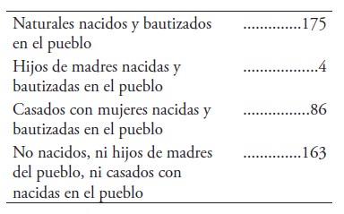 Este pueblo era uno de los que havia en tiempo de los Yndios, y por tal se ha tenido después, aunque raro es el que ha quedado de Color de esta nación, porque á la reserva de una familia, que lo conserva, todas las demás son mestizas, y dos, ó tres blancas, que se han avecindado en él (Morell de Santa Cruz, 2005, p. 97).