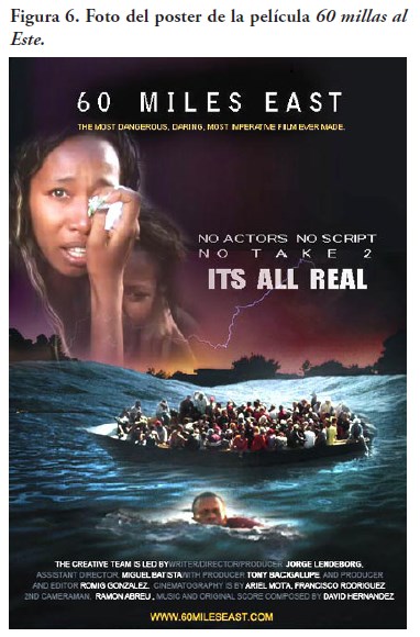 Menos gentiles que Sanky Panky (figura 5), existen otros filmes dominicanos que tratan de interponer un argumento de definición social frente a la problemática de los viajes ilegales, utilizando la yola para ir a Puerto Rico. Entre estos está Viajeros, de Carlos Bidó (2006), el cual embiste directamente la marginalidad de muchos que se arriesgan a “irse en yola” para “emigrar por mar de forma irregular en una embarcación precaria” (DED, 2013, p. 710) y cruzar el Canal de la Mona para buscar una mejoría en sus vidas.