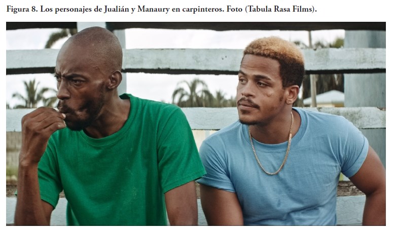 En otra tonalidad, aunque siempre tendente a la exploración del drama carcelario, Carpinteros (2017; figura 8), de José María Cabral, muestra una historia que mezcla el drama carcelario con un triángulo amoroso que viene a convertirse en su pivote, intuyendo que la garantía de esta situación mantendría a flote todo el andamiaje de la película.