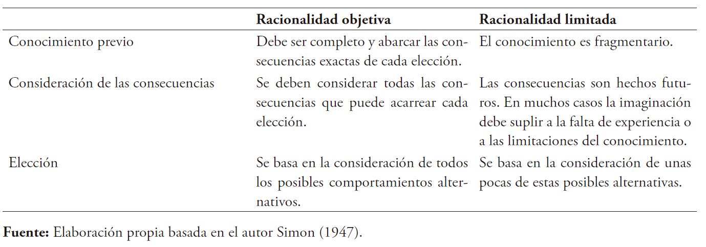 Los aspectos fundamentales de esta distinción se pueden apreciar en la tabla 1, expresados como las diferencias entre la racionalidad objetiva asociada al hombre económico y la racionalidad limitada asociada al hombre administrativo.
