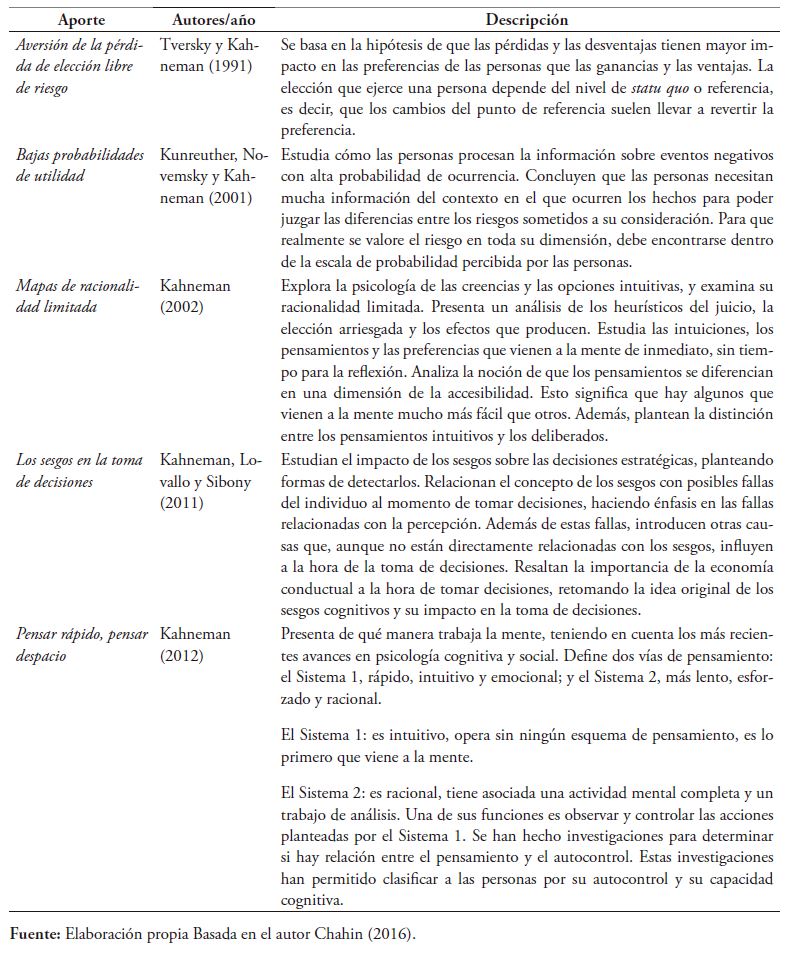 Es así como Daniel Kahneman, psicólogo de profesión, fue galardonado en el año 2002 con el premio Nobel de Economía, por sus estudios sobre la toma de decisiones en situaciones de riesgo e incertidumbre, pasando de ser catedrático de Psicología de la Universidad de Princeton a miembro de la Real Academia de Ciencias Económicas y Financieras (Chahin, 2016). Según este autor, las contribuciones de Kahneman y sus colaboradores a la administración pueden resumirse a través de una revisión de sus principales publicaciones, como se muestra en la tabla 2.