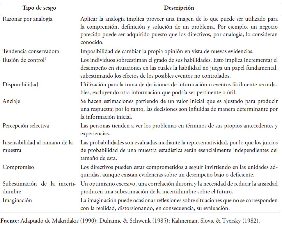 En el ámbito empresarial, las decisiones involucran aspectos vitales para la organización que se pueden traducir en ventajas o desventajas competitivas, llegando incluso a comprometer la supervivencia. Decidir involucra analizar situaciones inciertas, con las limitaciones de la información de la que se dispone, según los sesgos cognitivos del decisor. En esta investigación se asume la posición de que los sesgos son potencialmente distorsionantes; por tal razón, pueden tener una connotación negativa en un proceso de toma de decisiones. La posición de la mayoría de los autores de esta corriente se concentra en desarrollar estrategias orientadas a minimizar su impacto.