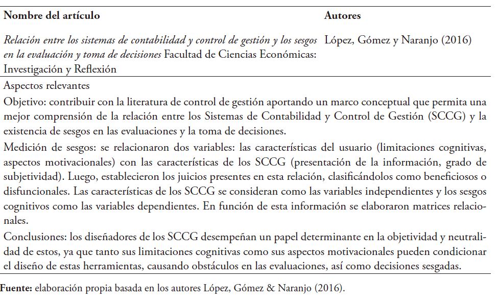 López, E.; Gómez, J. & Naranjo, D. (2016). Relación entre los sistemas de contabilidad y con- trol de gestión y los sesgos en la evaluación y toma de decisiones. Facultad de Ciencias Económicas: Investigación y Reflexión, 24(1), 13-24.