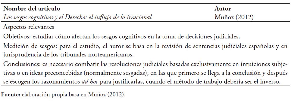Muñoz, A. (2012). Los sesgos cognitivos y el dere- cho: el influjo de lo irracional. El notario del siglo XXI, 42(2), 60-67.