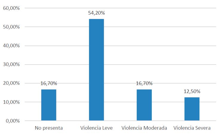 El 54.2% de las participantes presentó violencia psicológica leve, seguida por un 16.7% para las categorías Violencia Moderada y No presenta, respectivamente. Por último, un 12.5% de las participantes mostró violencia psicológica severa. Es decir, de alguna manera, el 83.3% presentó violencia psicológica. Por tanto, sería importante definir estas categorizaciones. En la figura 3, se grafican los tipos de abuso psicológico encontrados. Figura 3. Tipos de abuso psicológico 16,70% 54,20% 16,70% 12,50% 0,00% 10,00% 20,00% 30,00% 40,00% 50,00% 60,00% No presentaViolencia LeveViolencia ModeradaViolencia Severa57,5743,7120,0213,18010203040506070Abuso