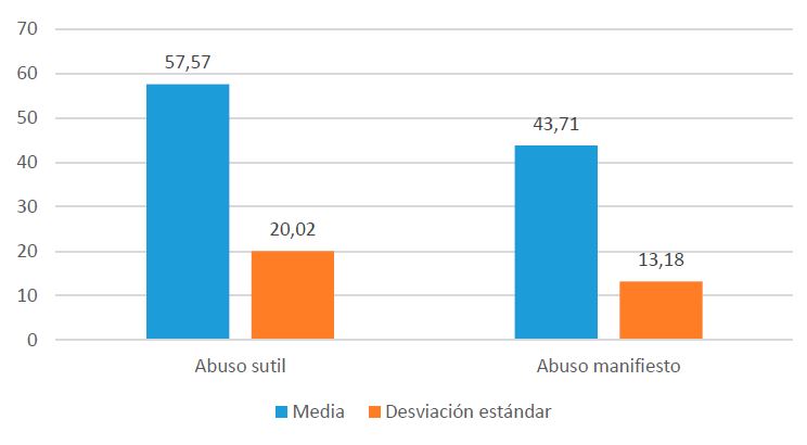 Los tipos de abuso psicológico se clasifican en sutil y manifiesto; el primero presenta una media de 57.57 y una desviación estándar de 20.024; mientras que el segundo obtuvo una media de 43.71 y una desviación estandar (DS)=13.175.