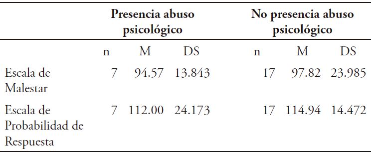 Las participantes sin presencia de abuso psicológico, en la Escala de Malestar, obtuvieron una media de M=97.82 y una DS=23.985 y, en la dimensión Probabilidad de Respuesta puntuaron con una media de M=114.94 y DS=14.472.