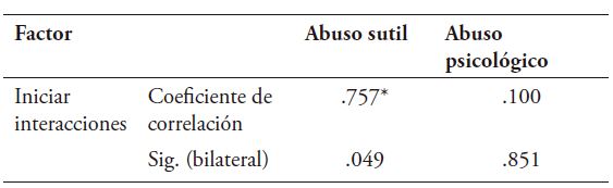 A su vez, existe una relación entre el abuso psicológico sutil y el factor Iniciar interacciones de la Escala Probabilidad de Respuesta, validando así –de manera parcial– la hipótesis número 2: existe una relación entre la asertividad y el abuso psicológico.