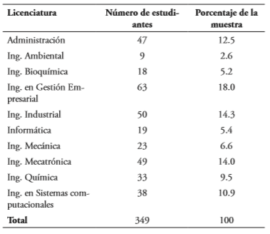 El muestreo utilizado para esta investigación fue aleatorio estratificado con afijación proporcional, de una población de 4,689 estudiantes del Instituto Tecnológico de Celaya, con año de nacimiento entre 1981 y 2000 (millenials). Se determinó un margen de error de 5% y un nivel de confianza de 95%. El total de la muestra de estudio se compone de 349 estudiantes de los últimos semestres de pregrado tanto del área de licenciatura como de ingeniería del Instituto Tecnológico de Celaya, los cuales se distribuyen en diez carreras profesionales, como se muestra en la tabla 1. El porcentaje de hombres fue de un 49%, mientras que el de mujeres de un 51%. Los rangos de edades predominantes de la muestra fueron de 21 a 23 años, en un 85%.
