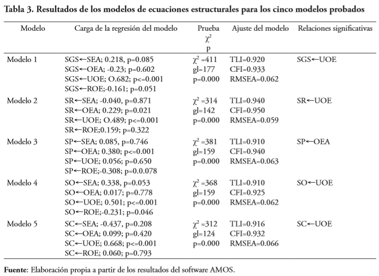 Todos los modelos evaluados tienen parámetros deseables y aceptables (Jöreskog & Sörbom, 1981; Muthe´n & Muthe´n, 1998-2007; Rigdon, 1996). La relación de los parámetros, así como sus relaciones significativas se muestran en la tabla 3.