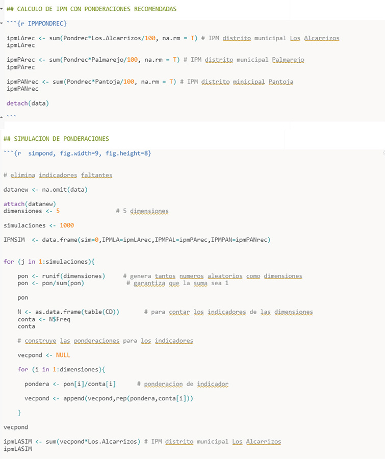 Se estudia el cálculo del índice de pobreza multidimensional (IPM) para los distritos municipales Los Alcarrizos, Pantoja y Palmarejo -Villa Linda, usando la información levantada por el Sistema Único de Beneficiarios (SIUBEN) en el año 2021. Dado que no se pudo recabar toda la data necesaria para el cálculo del IPM, se propone una alternativa al método de Alkire-Foster, donde, en lugar de usar contadores se usan proporciones para determinar el impacto de los indicadores de privación. Fue necesario usar aproximaciones de los indicadores donde el informe de SIUBEN no esclarecía la información. Utilizando simulación para la asignación de las ponderaciones, se pudo determinar que se necesita un mejor criterio que simplemente homologar los pesos de las cinco (5) dimensiones de privación. Este estudio contribuye con la aplicación del método de Análisis de Componentes Principales (PCA) para la determinación de las ponderaciones de los indicadores de privación, eliminando la necesidad de usar valores arbitrarios para las mismas.