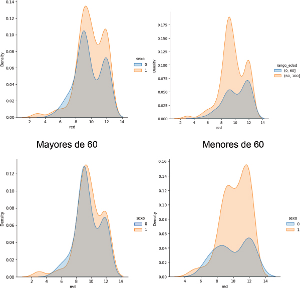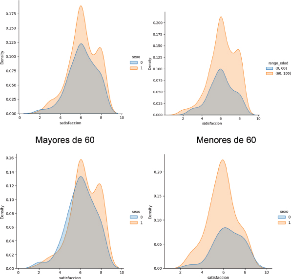 Nota: cero corresponde a hombre y 1 a mujer. En los gráficos inferiores el primero corresponde a mayores de 60 años y el segundo a menores de dicha edad.