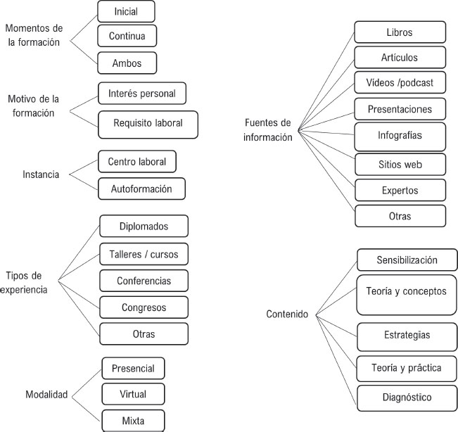 Los talleres y cursos se reportaron como las experiencias más destacadas en la formación, mientras que la modalidad más recurrente ha sido la mixta. En el caso de las fuentes de información, los artículos de investigación y los sitios web son los más referidos por el profesorado. Al respecto, Tas (2022) coincide en que los docentes consultan fuentes de internet, foros y blogs, para informarse sobre temas de inclusión educativa. Condiciones que debido a su pertinencia en la actual sociedad del conocimiento deben ser tomadas en cuenta para garantizar la participación de los profesores y evitar barreras que dificulten sus procesos formativos.