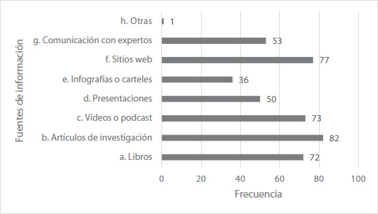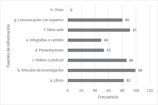 Como se observa, los artículos de investigación (18%, n=82), los sitios web (17%, n=77), los vídeos o podcast (16%, n=73) y los libros (16%, n=72) han sido las fuentes más utilizadas.