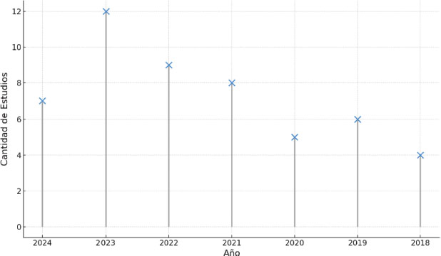 La búsqueda bibliográfica se llevó a cabo entre enero y marzo de 2024, limitando el periodo de análisis a publicaciones realizadas entre 2018 y 2024. Este rango temporal fue cuidadosamente seleccionado para garantizar la relevancia y actualidad de los estudios, permitiendo abarcar un conjunto manejable de contribuciones recientes y significativas sobre el contenido de las letras en la música urbana. Este enfoque temporal también respondió a la necesidad de identificar tendencias contemporáneas en el impacto cultural y social de este género musical. El gráfico 1 presenta la distribución de los estudios seleccionados por año de publicación, lo cual permite visualizar el aumento progresivo de investigaciones en torno a esta temática, con un pico notable en el año 2023.