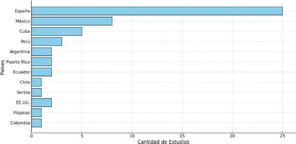 Para la recuperación de documentos, se emplearon varias ecuaciones de búsqueda que combinaban operadores booleanos con términos clave relacionados con la música urbana, como: “música urbana AND letras explícitas,” “reguetón AND percepción,” “letras de canciones AND estudiantes,” y “contenido lírico AND impacto social.” Estas ecuaciones fueron diseñadas para capturar estudios que analizaran tanto las dimensiones líricas como los impactos sociales de este fenómeno. Además, se realizaron búsquedas en inglés y español para reflejar la dimensión internacional del fenómeno, particularmente su relevancia en América Latina, Europa y otras regiones. El gráfico 2 muestra la distribución de los estudios recuperados según el país de origen, destacando a España como el país con mayor cantidad de investigaciones identificadas, seguido por México, Cuba y Perú. Este patrón evidencia una fuerte concentración de estudios en contextos hispanohablantes, lo cual resulta coherente con la geografía cultural de la música urbana.