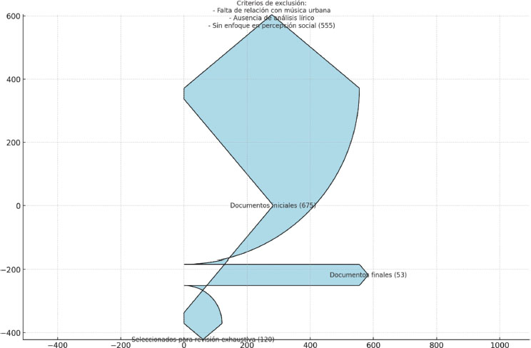Entre los estudios seleccionados, 35 se centraron en el análisis de letras de canciones, explorando temas como violencia, sexualidad y roles de género. Otros 18 abordaron la percepción de los oyentes, especialmente adolescentes, en relación con estas letras. Este enfoque permitió una comprensión integral de cómo las letras de la música urbana influyen tanto en las dinámicas individuales como en los entornos educativos. El gráfico 3 representa el proceso de selección y exclusión de la literatura analizada, desde los 1,208 documentos identificados inicialmente hasta los 53 que cumplieron con todos los criterios de inclusión. Esta visualización destaca los filtros aplicados, como la falta de análisis lírico, la ausencia de relación con la música urbana o la carencia de enfoque en la percepción social.
