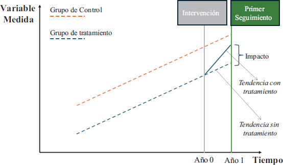 En el gráfico, se presentan dos grupos: el grupo de control (en naranja) y el grupo de tratamiento (en azul). Ambos grupos siguen una tendencia paralela en sus variables de resultado hasta el punto de intervención (Año 0), donde se introduce el programa. Posteriormente, en el primer seguimiento (Año 1), se observa que el grupo de tratamiento muestra un incremento en la variable de resultado mayor que el grupo de control, lo que se señala como el “Impacto” del programa. La línea discontinua azul proyectada desde el Año 0 al Año 1 indica la tendencia que hubiera seguido el grupo de tratamiento en ausencia del programa, basada en la tendencia del grupo de control.