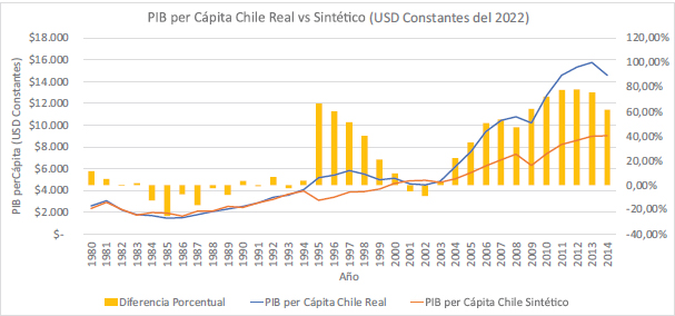 La Figura 3 refuerza esta interpretación al mostrar una tendencia ascendente en el PIB per cápita real de Chile en comparación con el contrafactual sintético, especialmente a partir del año 2000. Las barras amarillas representan la diferencia porcentual, mientras que las líneas muestran las trayectorias del PIB per cápita real y sintético. La clara divergencia entre las dos líneas a partir de los años 2000 destaca el impacto positivo de las políticas implementadas en Chile.
