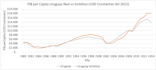 Comparación de PIB per cápita Uruguay Real y Uruguay Sintético, 1980-2014