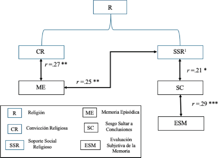 Nota. CR: Convicción religiosa, SSR: Soporte social religioso, R: Creencias religiosas, SC: Sesgo de saltar a conclusiones, SI: S. de inflexibilidad de creencias, SAE: S. de atribución externa, SAA: S. de atención a las amenazas, S: Sesgos cognitivos, ESM: Evaluación subjetiva de la memoria, ME: Memoria episódica, M: Memoria * p < .05, ** p < .01, *** p < .001.