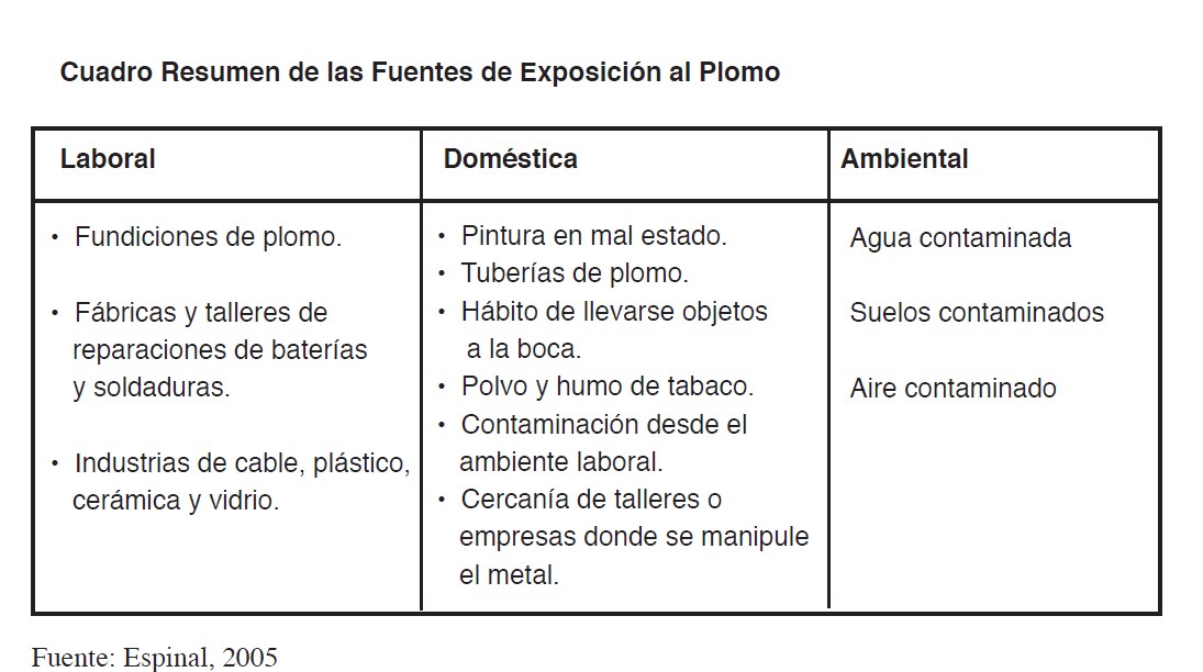 El plomo en el ambiente es ubicuo, proviene de diversas fuentes: combustión de naftas adicionadas con plomo, emisiones industriales, fábricas de acumuladores, pinturas a base de plomo, cerámicas vidriadas con plomo, entre otras.5