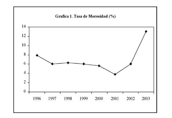 La Gráfica 1 muestra la relación entre los préstamos morosos sobre la cartera total (NPLTL) para el sector bancario dentro del período 1996-2003. Esta Gráfica muestra como, a partir del 2001, esta relación ha ido en aumento desde su tasa mas baja del período, aproximadamente 3.78%. Sin embargo, no fue hasta el 2002 cuando esta relación experimentó un cambio dramático elevándose de un 6% a un 13.07%, aproximadamente, en el 2003. Usando datos de panel, con observaciones trimestrales de cada banco, una regresión colectiva se estimó de la siguiente forma: