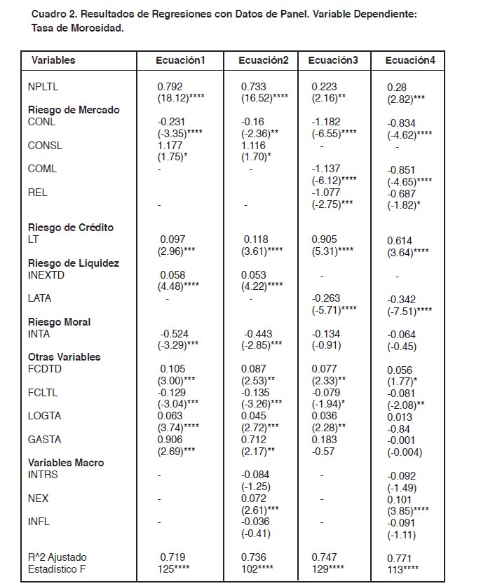 Los resultados de las regresiones se muestran en la Tabla 2. Debemos hacer notar que las variables reportadas en las ecuaciones son aquellas con mayor poder de predicción en el modelo. Aún así, otras variables “proxies” alternativas fueron consideradas; pero se determinó que estas no cambiaron los resultados previamente alcanzados. La Tabla 2 presenta que todas las variables correspondientes a las operaciones específicas de los bancos introducidas en la Ecuación 1 son significativas en explicar el comportamiento de la tasa de morosidad (potenciales problemas bancarios) con un trimestre de anticipación.