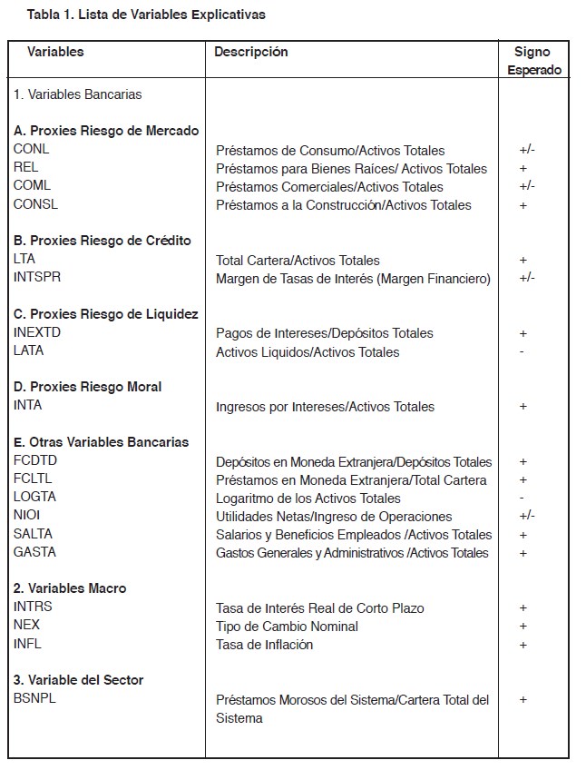 En la construcción de un modelo de alertas tempranas sobre posibles problemas bancarios, esta investigación utiliza el marco conceptual discutido por González‐Hermosillo (1996, 1999) en el cual los problemas bancarios son descritos como una función de riesgo de mercado, riesgo de crédito y riesgo de liquidez. En adición, algunas variables macroeconómicas y otras específicas del sector bancario son incorporadas en el modelo en un esfuerzo por integrar aspectos micro y macroeconómicos al tratar de pronosticar problemas en el sector financiero.