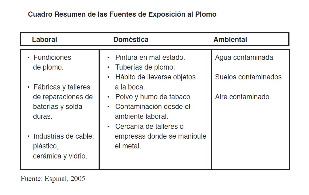 En el ámbito mundial, se consideran ocho fuentes principales de exposición al plomo entre niños y población en general (no necesariamente en el siguiente orden):