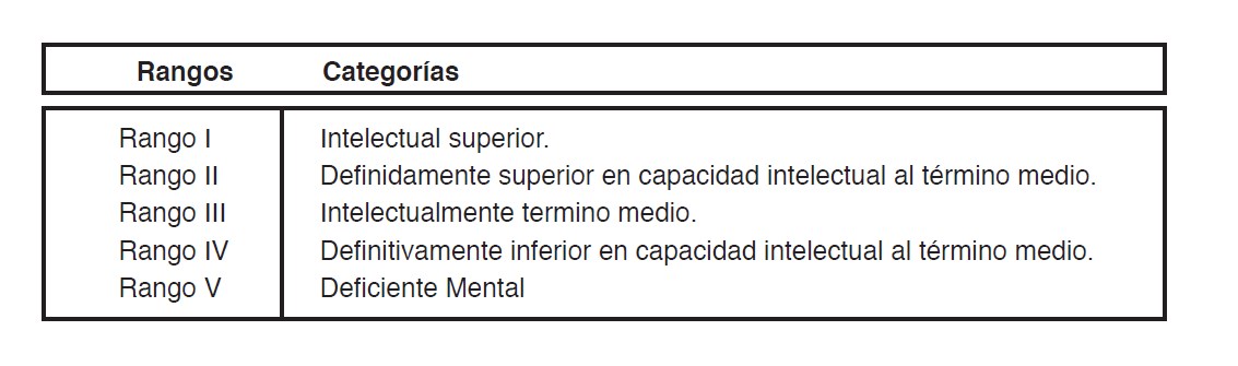 Por último, se presenta el rango v, con una frecuencia de 2 y un porcentaje de 4 %, su categoría correspondiente es la de Deficiente Mental.