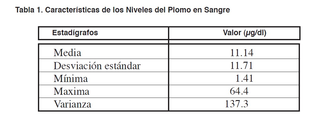 La media aritmética de los niveles del plomo en sangre fue de 11.14 µg/dl, valor por encima de 10 µg/dl que se acepta como “límite permisible”. Los valores extremos de la muestra fueron de 1.41 µg/dl y 64.4 µg/dl. (tabla 1).