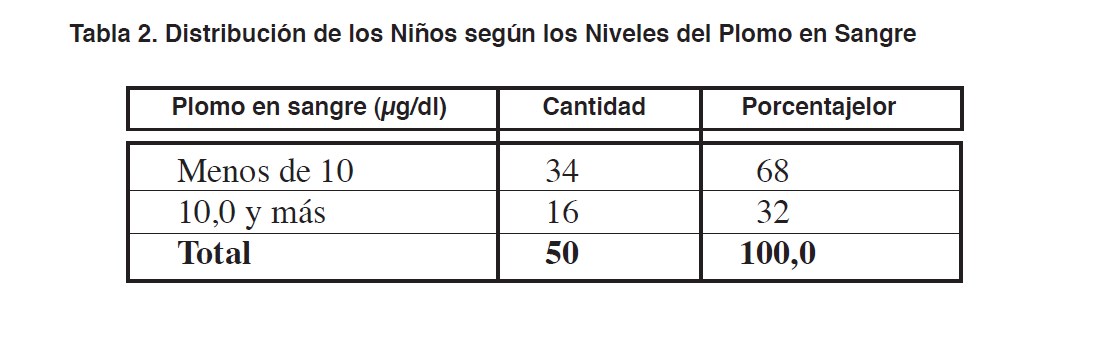 El 68 % de los niños presentó niveles de plomo en sangre por debajo de 10,0 µg/dl, mientras que el 32 % restante presentó cifras por encima de esta norma (tabla 2).