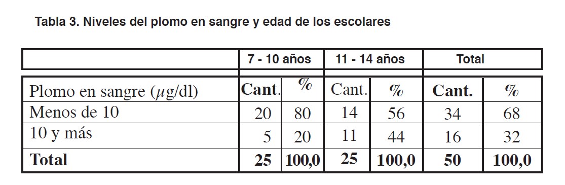 La mayor incidencia de niveles de plomo elevados se registró en los escolares cuyas edades estaban comprendidas entre 11 y 14 años (tabla 3).