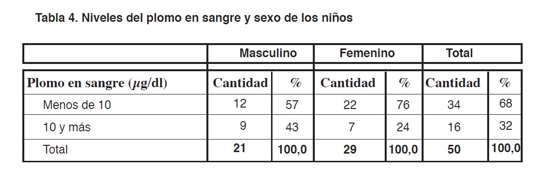 En la tabla 4 se observa que el porcentaje de niños con niveles de plomo en sangre elevado es superior al de las niñas aunque las diferencias por sexo no fueron estadísticamente significativas.