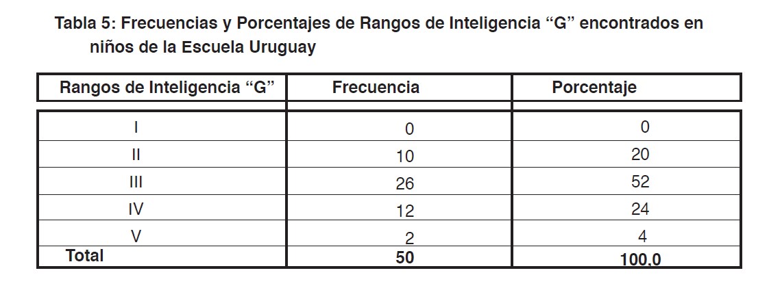 La tabla 5 muestra que el Rango de Inteligencia G encontrado con más frecuencia entre estos escolares fue el Rango iii, correspondiendo este a la categoría de Intelectualmente termino medio, con una frecuencia de 26 y un porcentaje de 52 %.