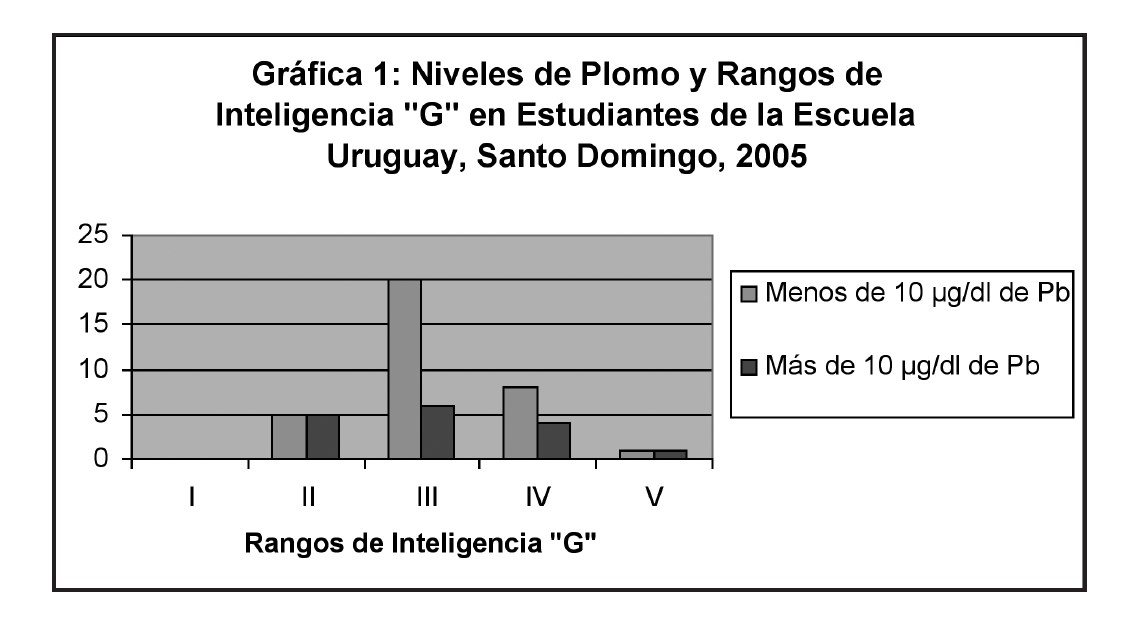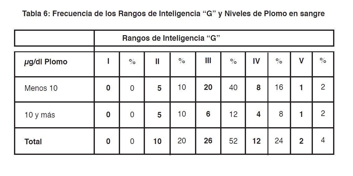 Los rangos de Inteligencia “G” encontrados en la mayor parte de los escolares cayeron en el Rango iii (52 %), perteneciente a la categoría de “intelectualmente término medio”. Lo que significa que los niveles de plomo que manejan los escolares no han impactado significativamente su rendimiento académico medido en estos rangos.