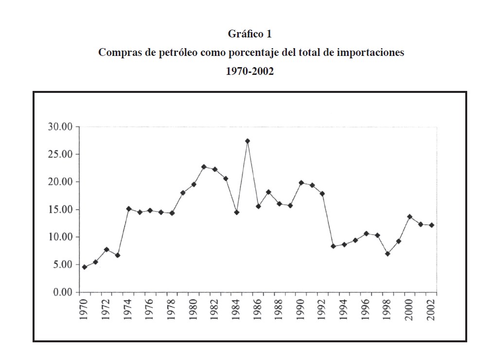 La República Dominicana está dotada con escasos recursos naturales energéticos que puedan ser aprovechados, lo cual implica que dependa ampliamente de las importaciones de petróleo para suplir sus necesidades energéticas. Las importaciones de petróleo representan un componente importante del total de las importaciones nacionales, éstas constituyeron en promedio el 10.76% de las compras anuales al resto del mundo durante el período 1996-2002, correspondiente a un consumo medio anual cercano a los 48 millones de barriles. El gráfico 1 muestra la tendencia de las importaciones de petróleo como porcentaje del total de las importaciones anuales. Este comportamiento es afectado por la apertura comercial y el crecimiento del producto real.