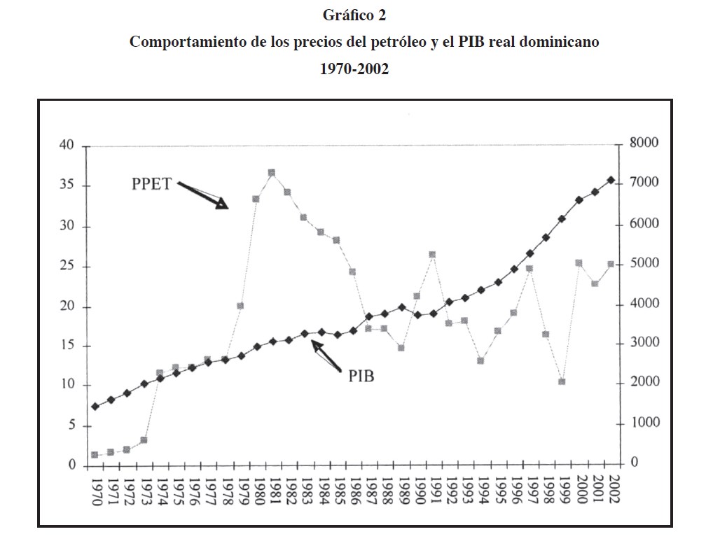 En este estudio se ha demostrado la influencia de los precios del petróleo sobre la economía dominicana, específicamente en el Producto Interno Bruto y los precios internos. Para tales fines, se estimaron distintas funciones, utilizando información del Banco Central de la República Dominicana y tomando segmentos de períodos desde 1970 a 2002. Como no se habían realizado estudios de esta naturaleza, esta investigación constituye una novedad.