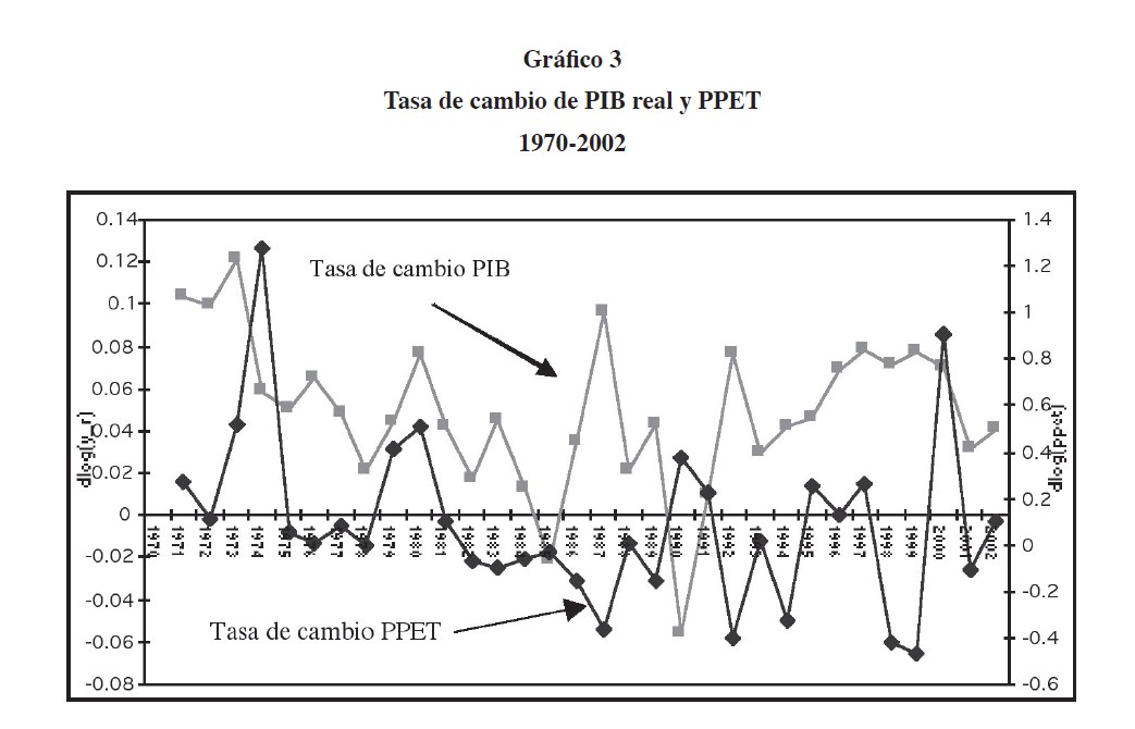 La representación gráfica de la serie anual de los PPET y del PIB real dominicano no revela con claridad la existencia de una relación inversa o correlación negativa entre ambas variables, según se observa en el gráfico 2. Al visualizar gráficamente las tasas de variación de ambas variables se aprecia mayor congruencia teórica en su relación en algunos segmentos de las series lo cual abre interrogantes sobre el vínculo de estas variables8, como muestra el gráfico 3. Una regresión simple entre estas dos variables revela una inconsistencia teórica en el resultado de las mismas, según se aprecia en los cuadros 1 y 2 en el anexo. En este sentido, cabe verificar si verdaderamente existe alguna causalidad estadística de estas series de forma que se revele que los PPET sí tienen alguna influencia sobre el comportamiento del PIB real dominicano. Este análisis se presenta en la siguiente sección.
