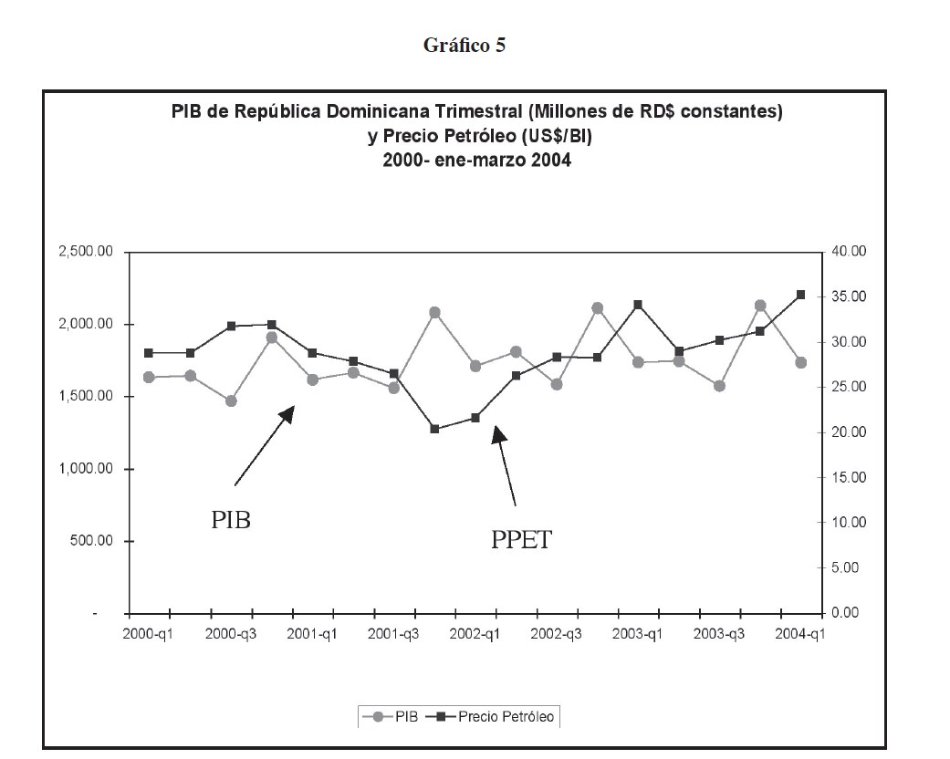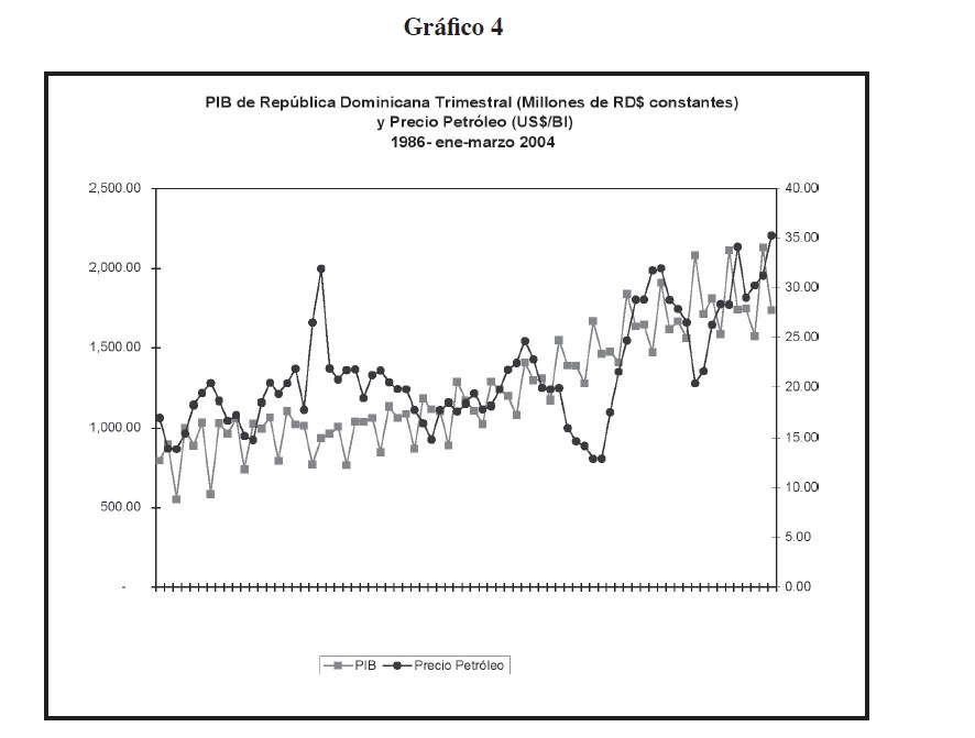 A partir de esta técnica, se comprueba la existencia de una relación de asociación estadística entre los PPET y el PIB real dominicano. Sin embargo, las distorsiones en el mercado dominicano de hidrocarburos a lo largo del período que abarca esta sección introducen ruidos en las series de forma que la relación entre los precios del petróleo y el PIB dominicano puede no verse reflejada adecuadamente en una serie histórica larga. Esto es así debido a que en los años anteriores a 2000, los cambios en los precios internacionales del petróleo no se traspasaban por completo al mercado interno. En dicho período, el Gobierno podía no traspasar la variación de los precios internacionales a los precios que pagaban los consumidores finales de los derivados del crudo, cuando lo entendiera necesario como parte de su estrategia de política. Esta situación puede verificarse incluso mediante la observación gráfica para unas series trimestrales como muestra el gráfico 4. El gráfico muestra la ausencia de una relación entre los precios internacionales del petróleo y el PIB trimestral para el período que va desde 1986 hasta el primer trimestre de 2004.