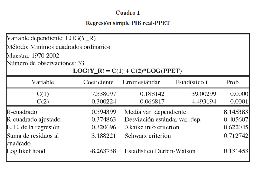 Los coeficientes computados en la estimación pueden interpretarse como elasticidades. En ese sentido, por cada punto porcentual de aumento del PPET el PIB real dominicano del período siguiente decrece en 0.02%.