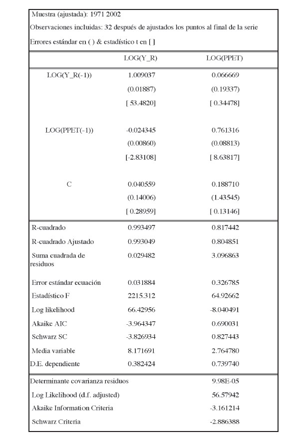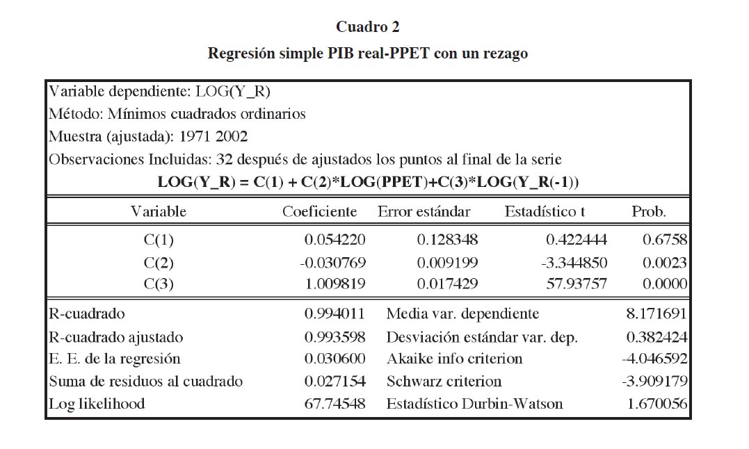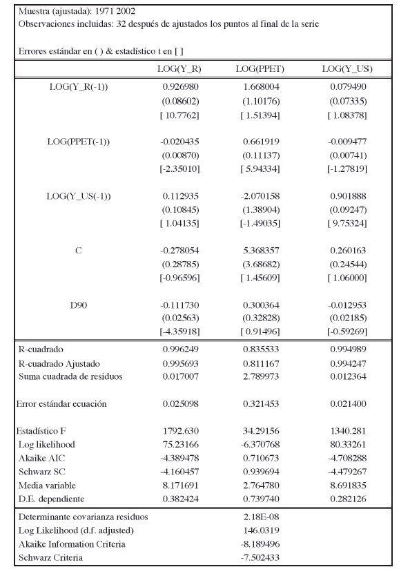 Para el segundo caso, dentro del conjunto de variables estimadas en el vector, se evalúa la ecuación en logaritmo del PIB real dominicano explicada por su propio rezago, los PPET rezagado en un período, el PIB real de los Estados Unidos retardado en un período y una variable ficticia que recoge la caída experimentada por el PIB real dominicano en el año 199010.